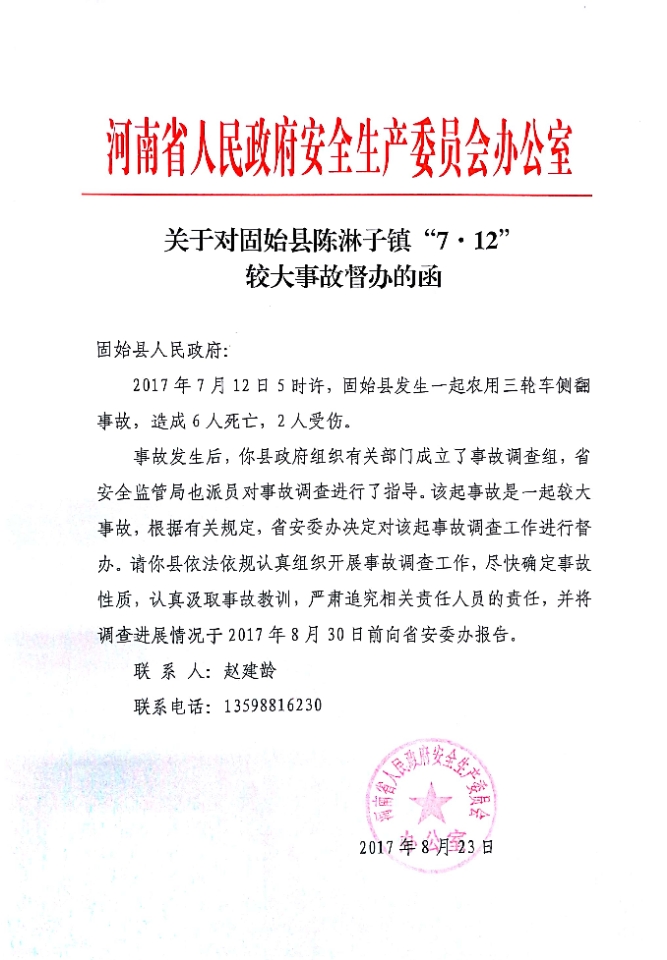 关于对固始县陈淋子镇“7.12”较大事故督办的函