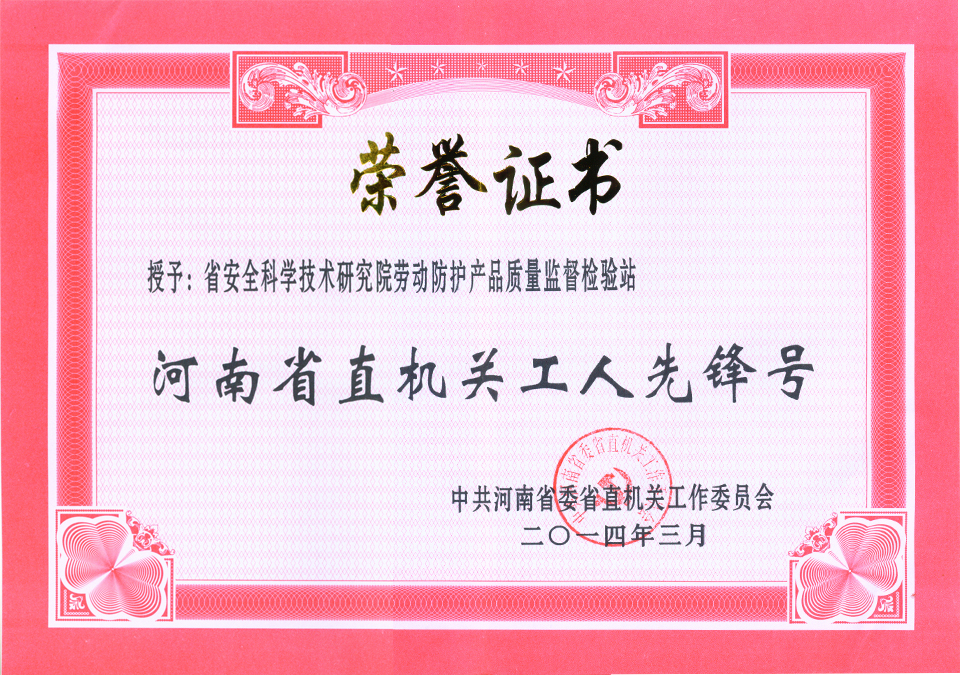 省安全科学技术研究院劳动防护产品质量监督检验站被省委省直工委表彰为“省直机关2012-2013年工人先锋号”