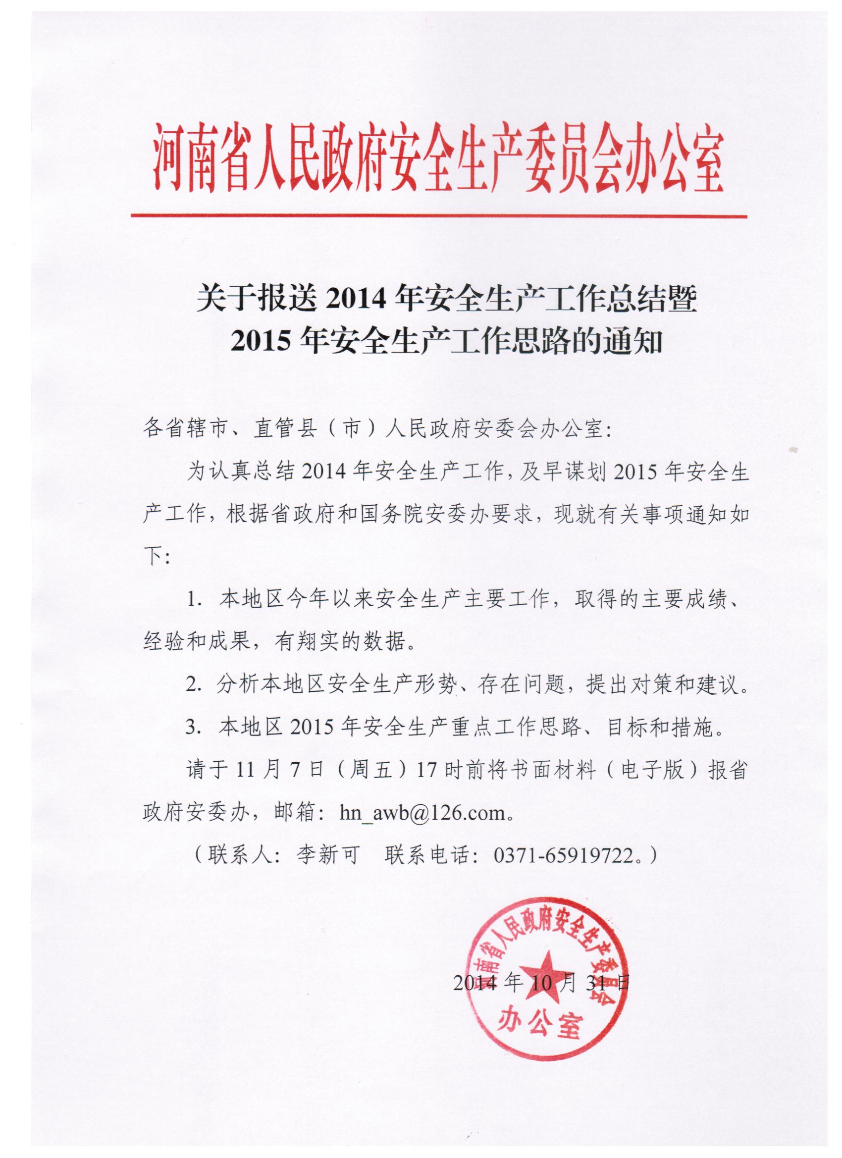 关于报送2014年安全生产工作总结暨2015年安全生产工作思路的通知
