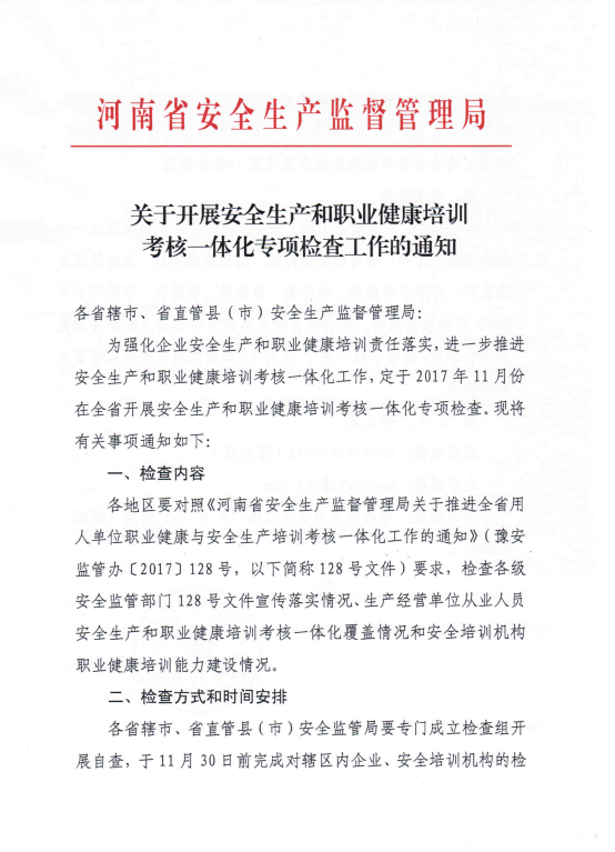 关于开展安全生产和职业健康培训考核一体化专项检查工作的通知