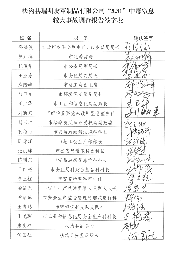 经调查认定,扶沟县瑞明皮革制品有限公司“5.31”中毒窒息较大事故是一起生产安全责任事故。